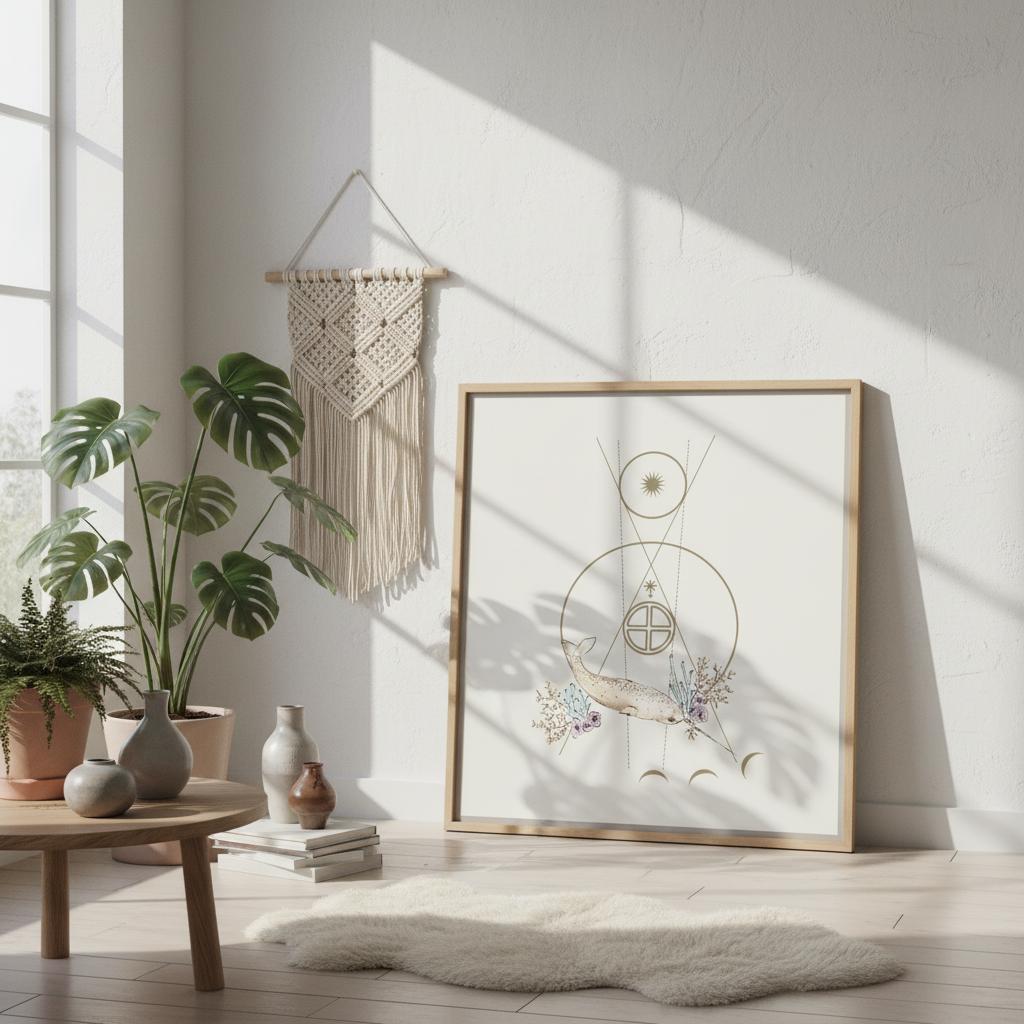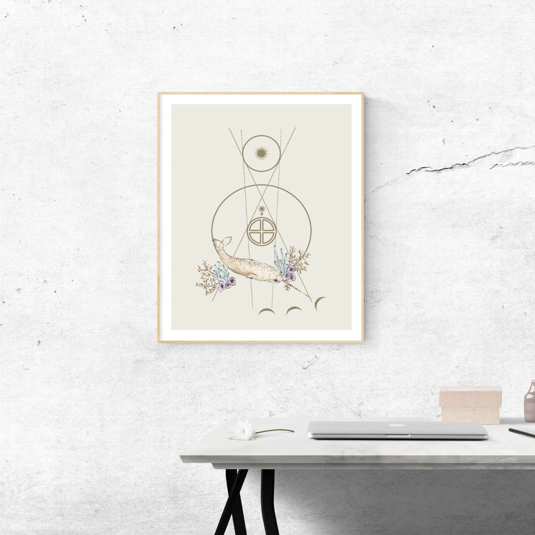 El narval navega entre dos mundos, como tú entre lo que ya fuiste y lo que estás por revelar. Este print te acompaña en momentos de transición, recordándote que el cambio no es pérdida, sino revelación.