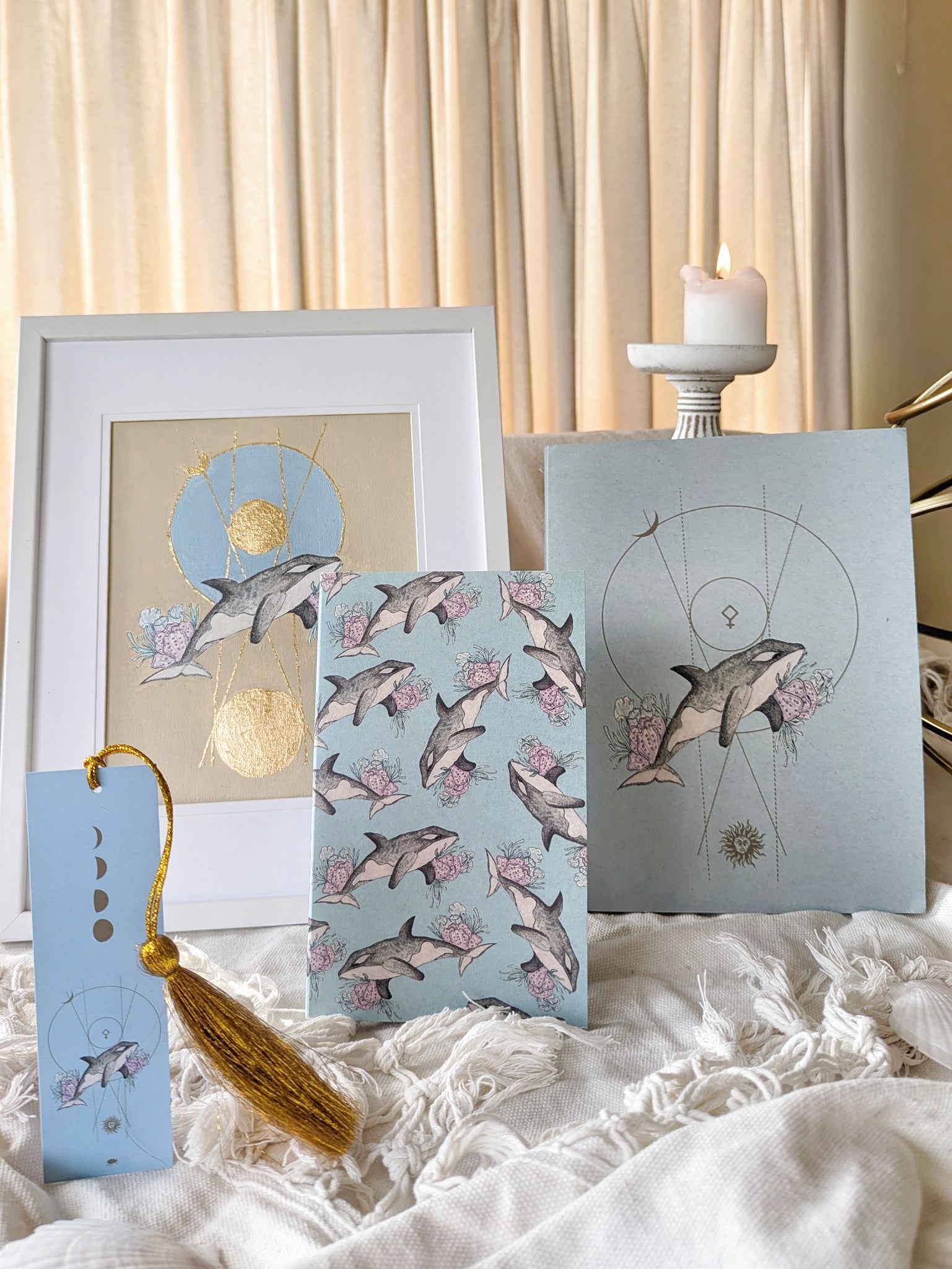 ✔ Ilustraciones originales en acuarela, inspiradas en orcas bajo un eclipse de luna.